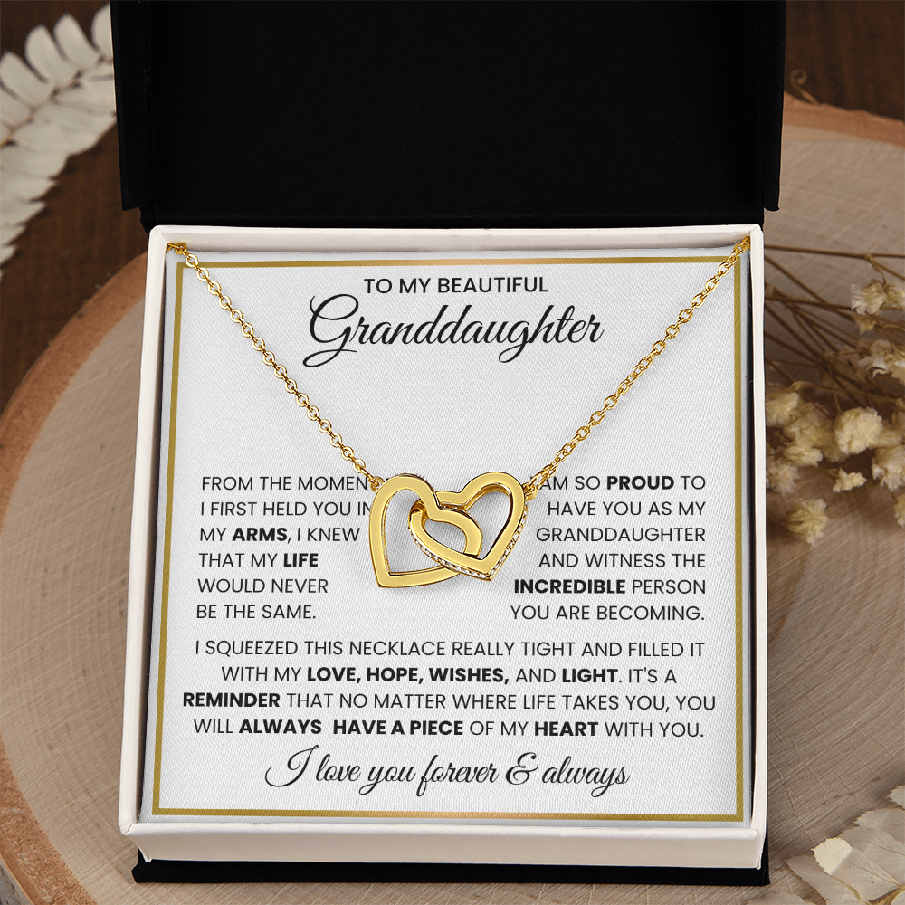 From the moment I first held you in my arms, I knew that my life would never be the same. I am so proud to have you as my granddaughter and witness the incredible person you are becoming. I squeezed this necklace really tight and filled it with my love, hope, wishes, and light. It's a reminder that no matter where life takes you, you will always have a piece of my heart with you. I love you forever & always.