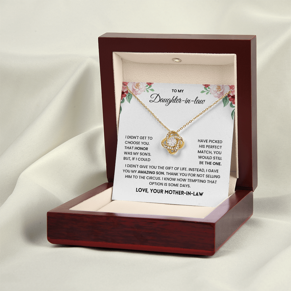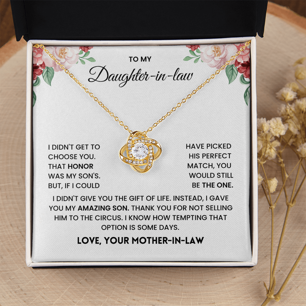 To My Daughter-in-law, I DIDN'T GET TO CHOOSE YOU. THAT HONOR WAS MY SON'S. BUT, IF I COULD HAVE PICKED HIS PERFECT MATCH, YOU WOULD STILL BE THE ONE. I DIDN'T GIVE YOU THE GIFT OF LIFE. INSTEAD, I GAVE YOU MY AMAZING SON. THANK YOU FOR NOT SELLING HIM TO THE CIRCUS. I KNOW HOW TEMPTING THAT OPTION IS SOME DAYS. LOVE, Your Mother-in-law.
