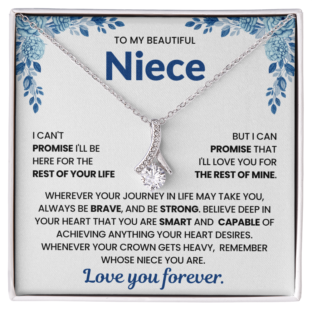 I can't promise I'll be here for the rest of your life But I can promise that I'll love you for the rest of mine. Wherever your journey in life may take you, always be brave, and be strong. Believe deep in your heart that you are smart and capable of achieving anything your heart desires. Whenever your crown gets heavy, remember whose niece you are. Love you forever.